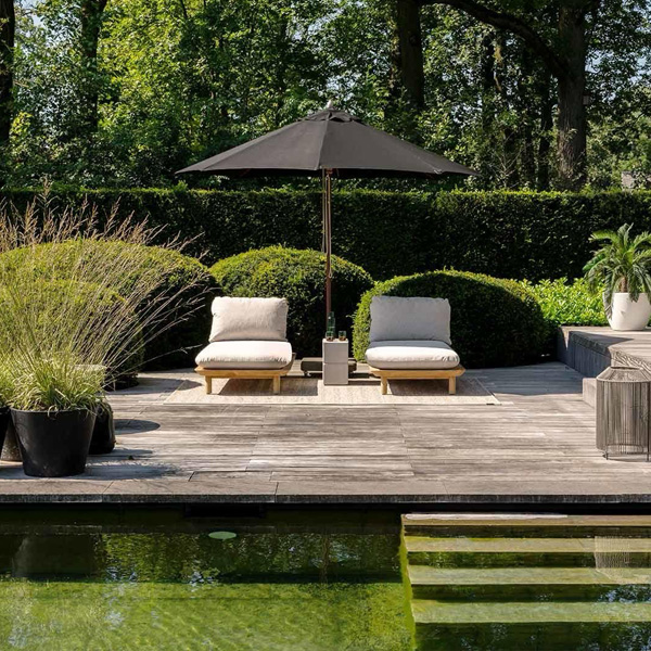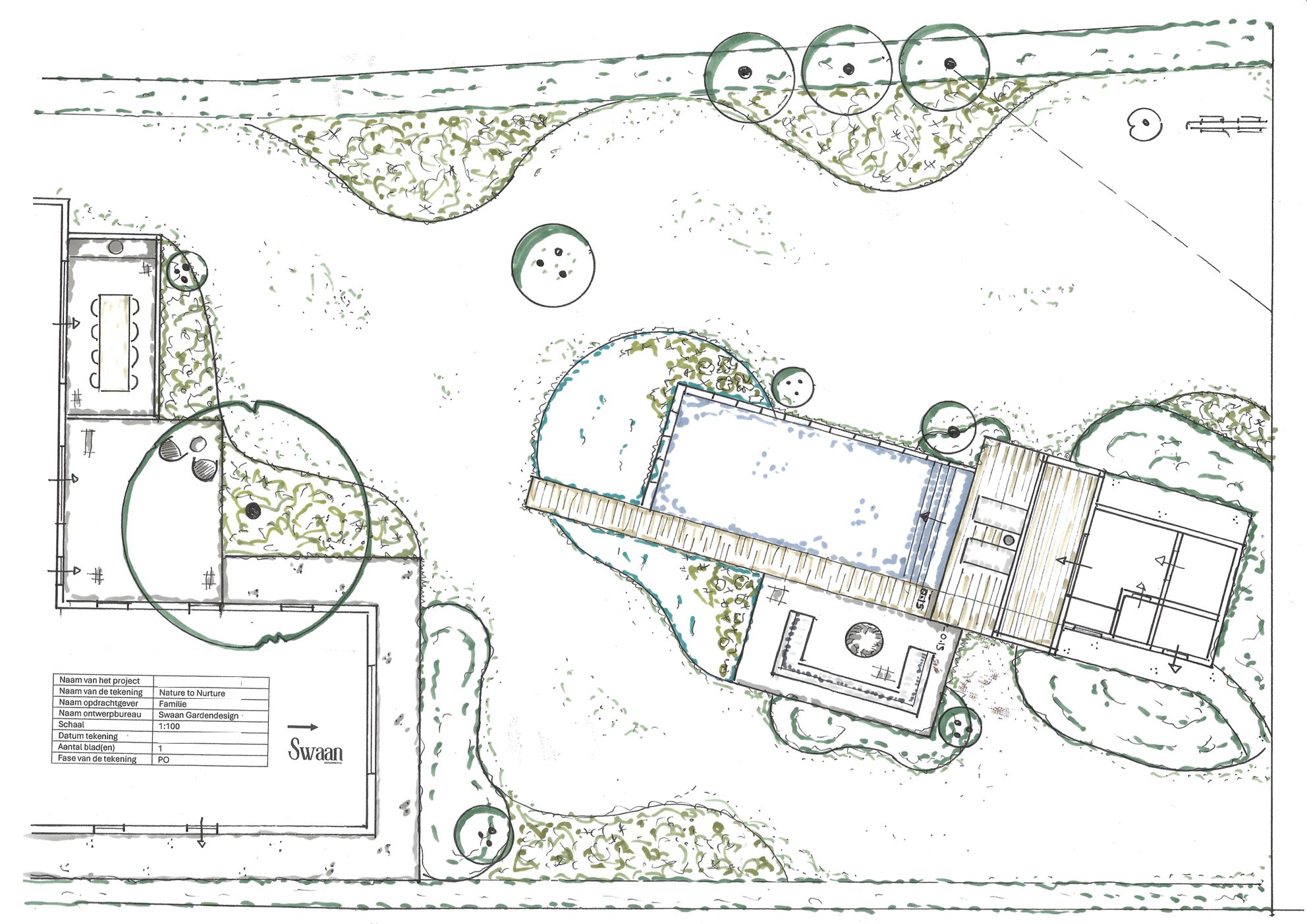 In deze prachtige tuin met veel volwassen beplanting ligt een grote vijver. De bewoners hebben mij gevraagd een ontwerp te maken om de vijver te veranderen tot een zwemvijver en de tuin aan te passen aan de huidige tijd. De oude vorm van de vijver heb ik zoveel mogelijk in ere gehouden en een zwembad met vijver er lang gemaakt. Via een lange steiger loop je naar het loungeterras met vuurplaats en tuinhuis met veranda en ligbedden ervoor.